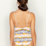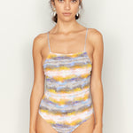 Flirty one piece with cut outs, tie front and moderate bottom coverage. Fixed straps for a seamless look. No adjusters. Featured here in our buttery soft waffle textured fabric.