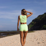 Swim vest top with low armholes and zipper back with zip pull.