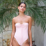 Flirty one piece with cut outs, tie front and moderate bottom coverage. Fixed straps for a seamless look. No adjusters. Featured here in our buttery soft waffle textured fabric.