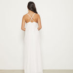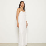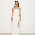 Long column dress with front panel detail. Featuring adjustable criss cross back straps and high thigh side slit. Fully lined.