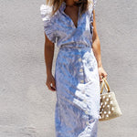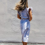 Ruffled sleeveless blouse with low armholes and keyhole back.