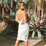 Slip dress cut on the bias with cowl back line and adjustable straps.