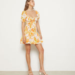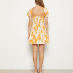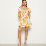 Mini dress with smocked bodice and full skirt. Featuring puffed sleeves and sweatheart neckline.