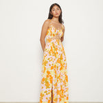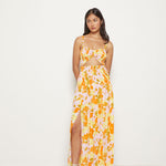 Cutout maxi dress with smocked bodice and side slit skirt. Elastic gathered shoulder straps.