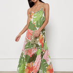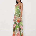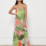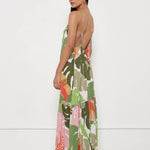 Flowy maxi dress with low back, ruffle details and adjustable straps.