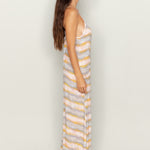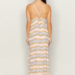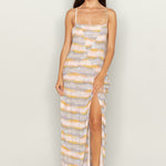 Long column dress with front panel detail. Featuring adjustable criss cross back straps and high thigh side slit. Fully lined.