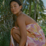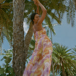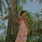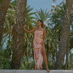 Long column dress with front panel detail. Featuring adjustable criss cross back straps and high thigh side slit. Fully lined.
