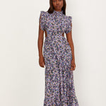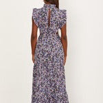 Maxi dress with side cutouts, tiered skirt and ruffle detail at neck and sleeves. Elastic waist and button neck closure.