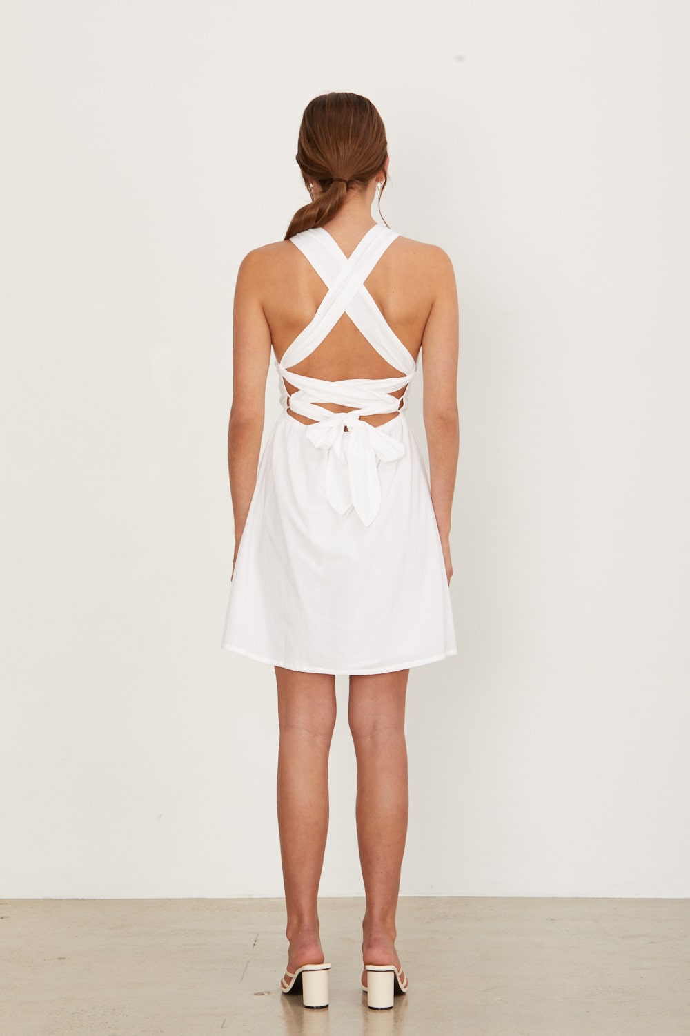 Mini dress with high neck halter and open back adjustable thick ties