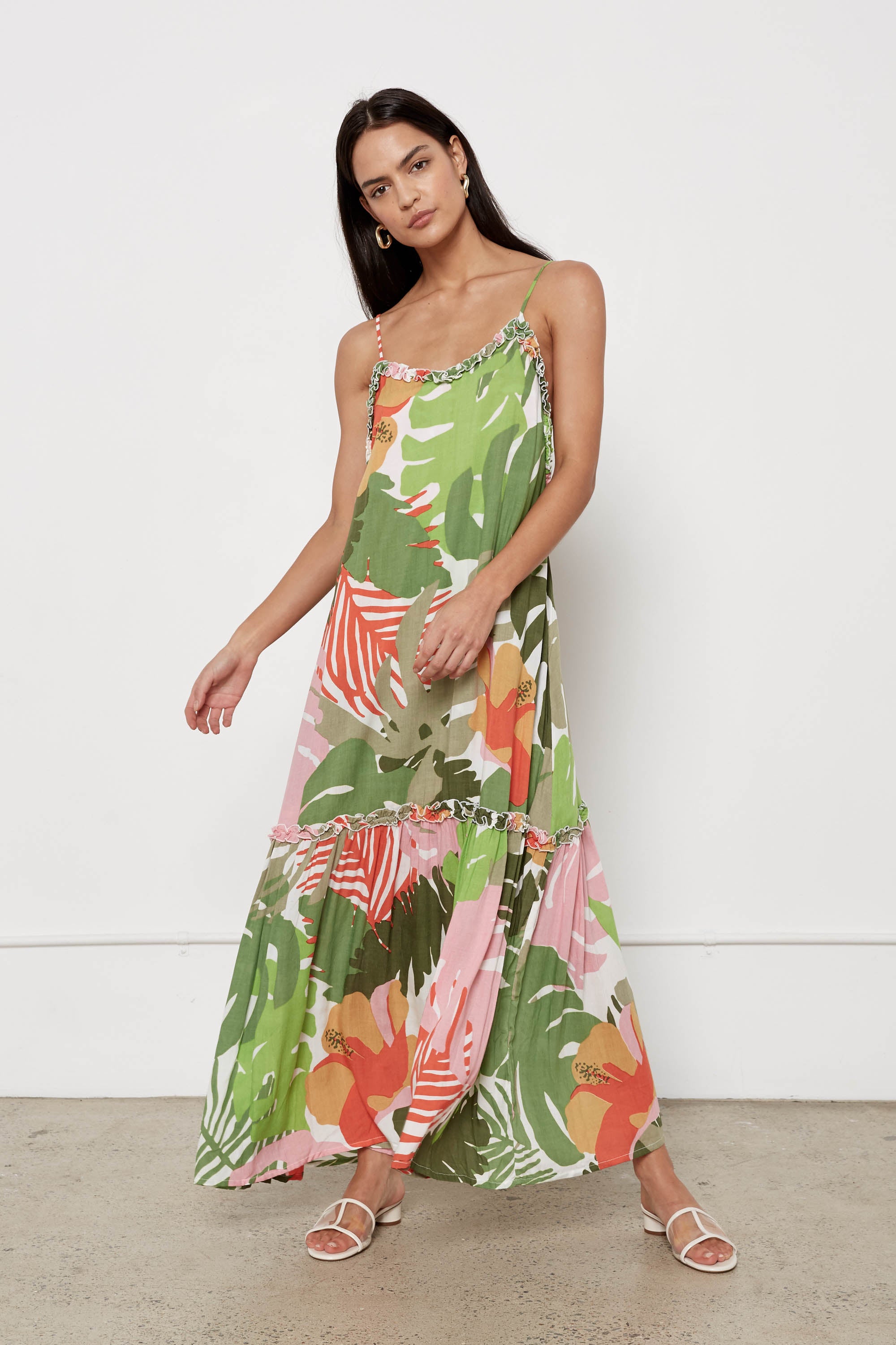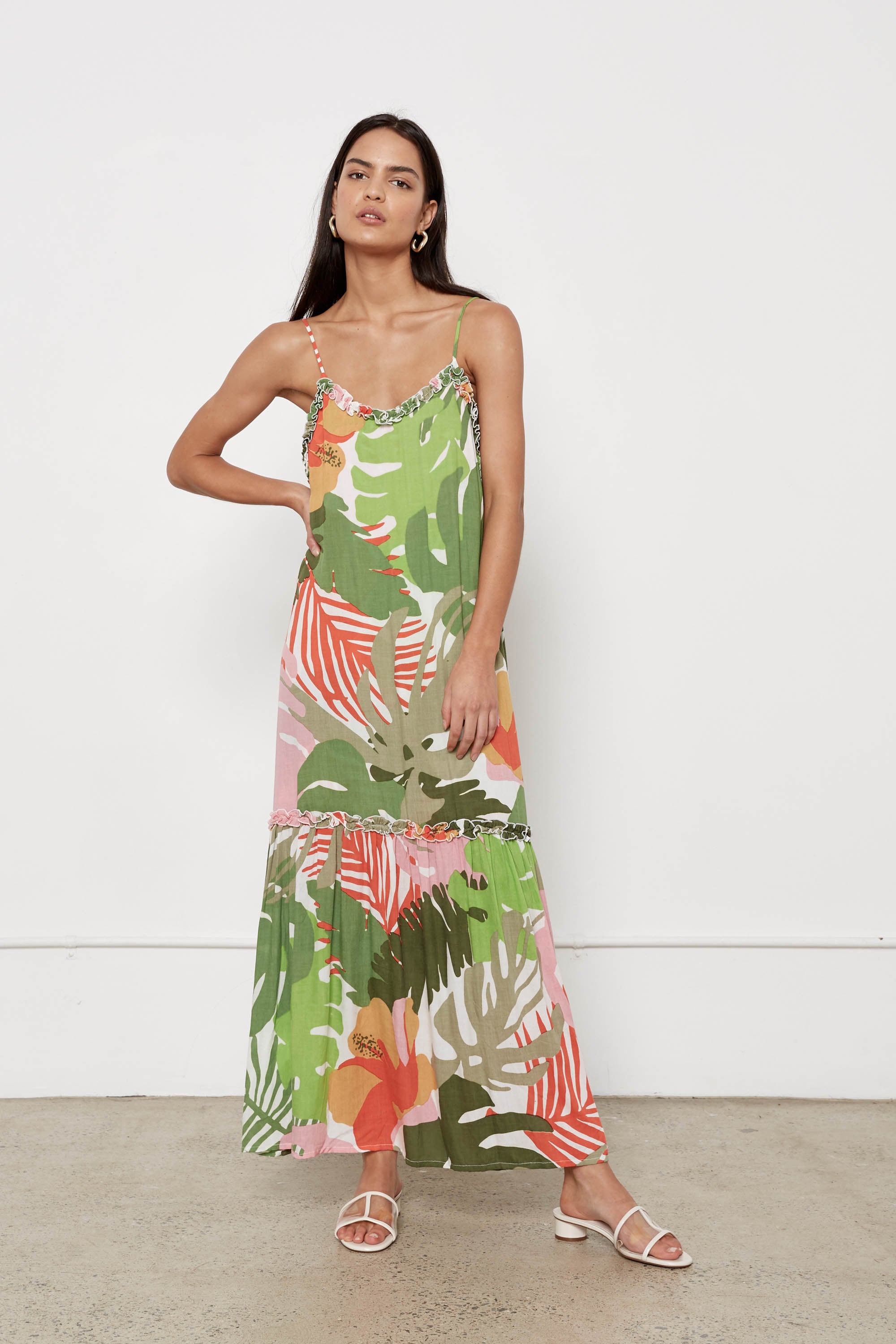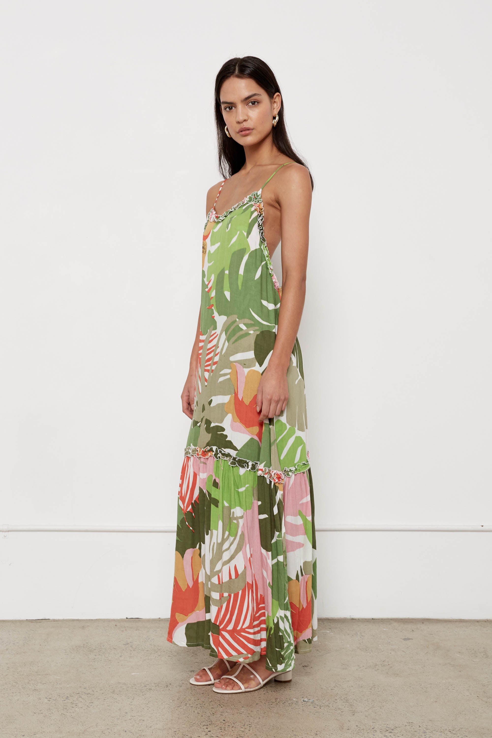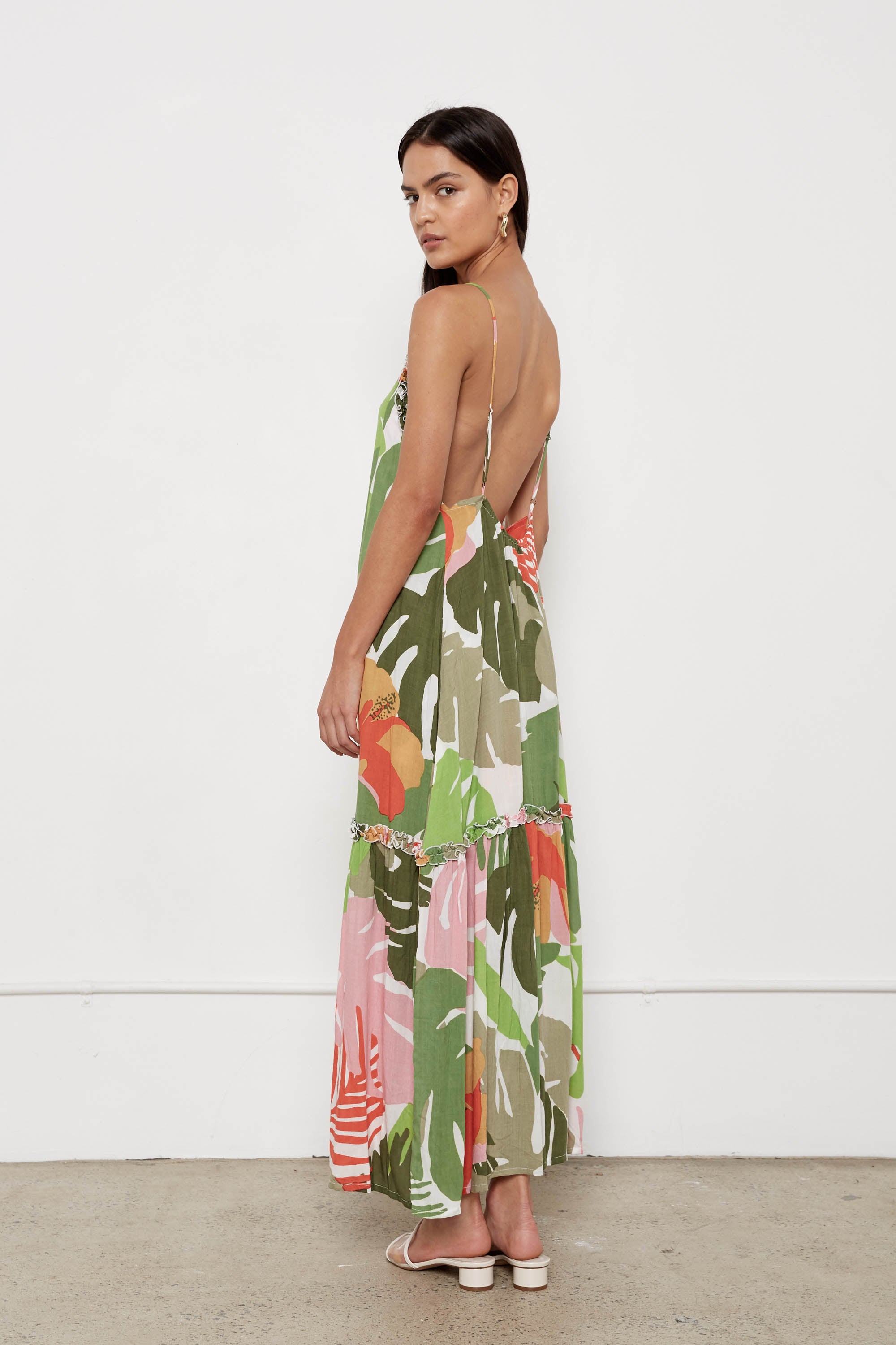 Flowy maxi dress with low back, ruffle details and adjustable straps.