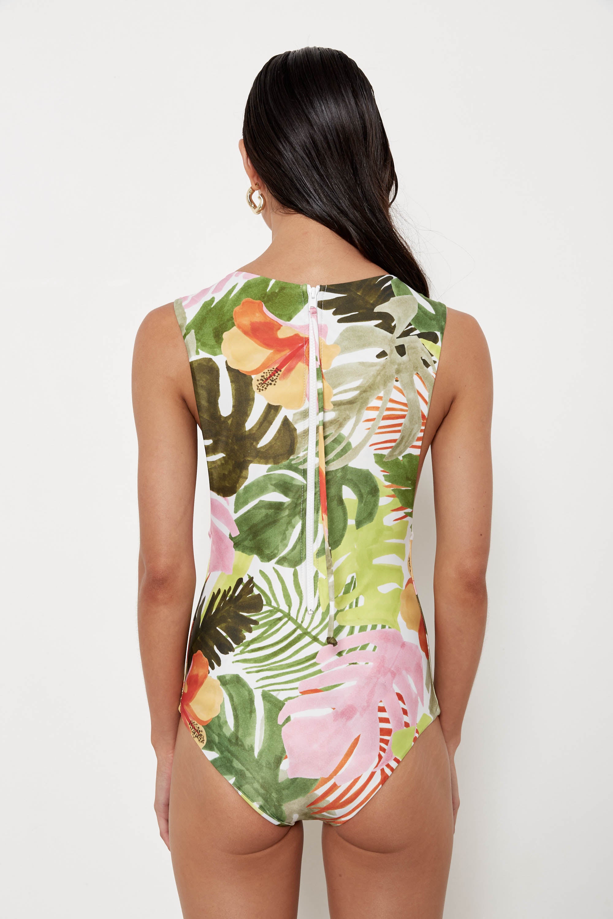 An elevated one piece surf suit with low armholes and zipper back with zip pull cord.