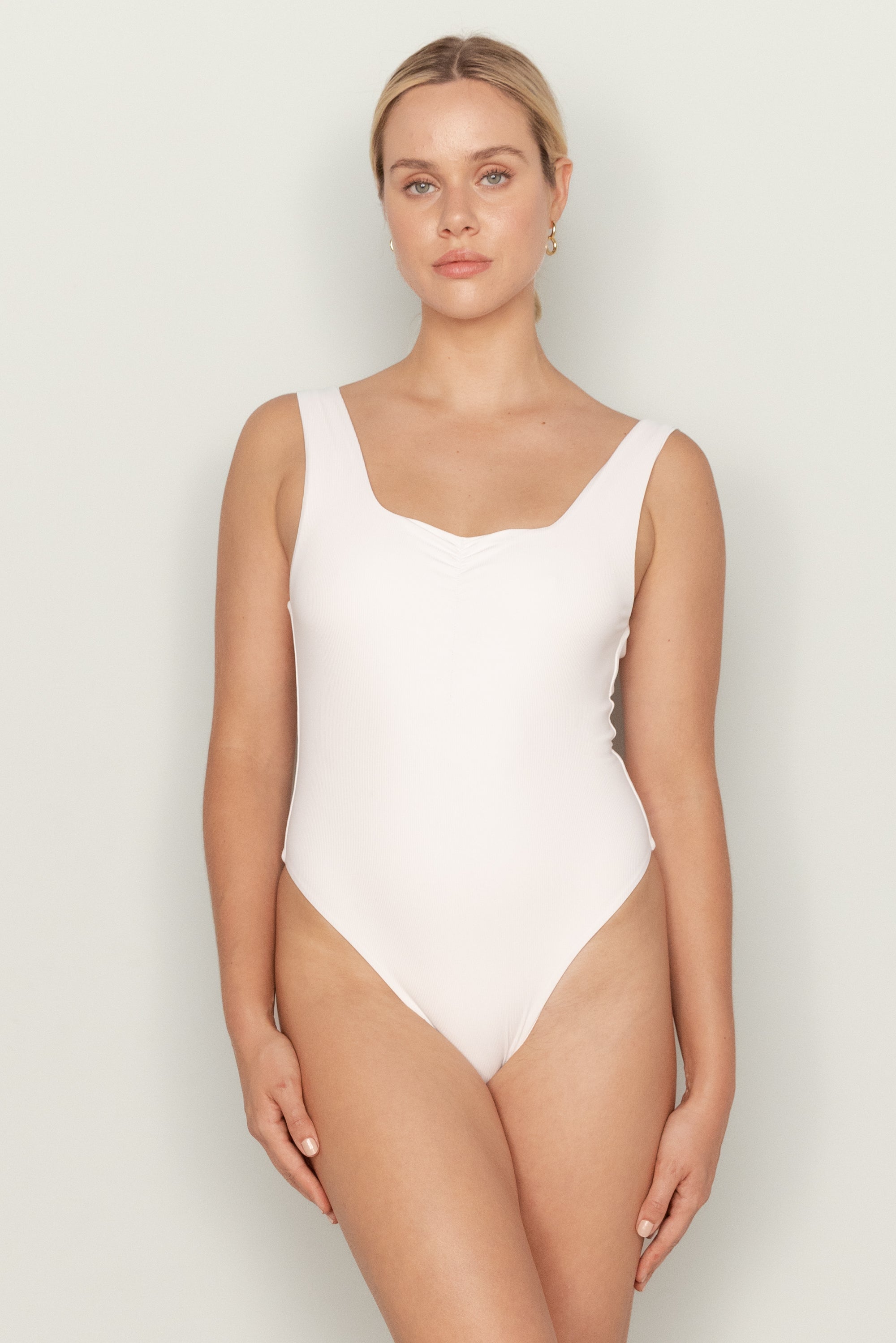 Wide strap one piece with ruche detail.
